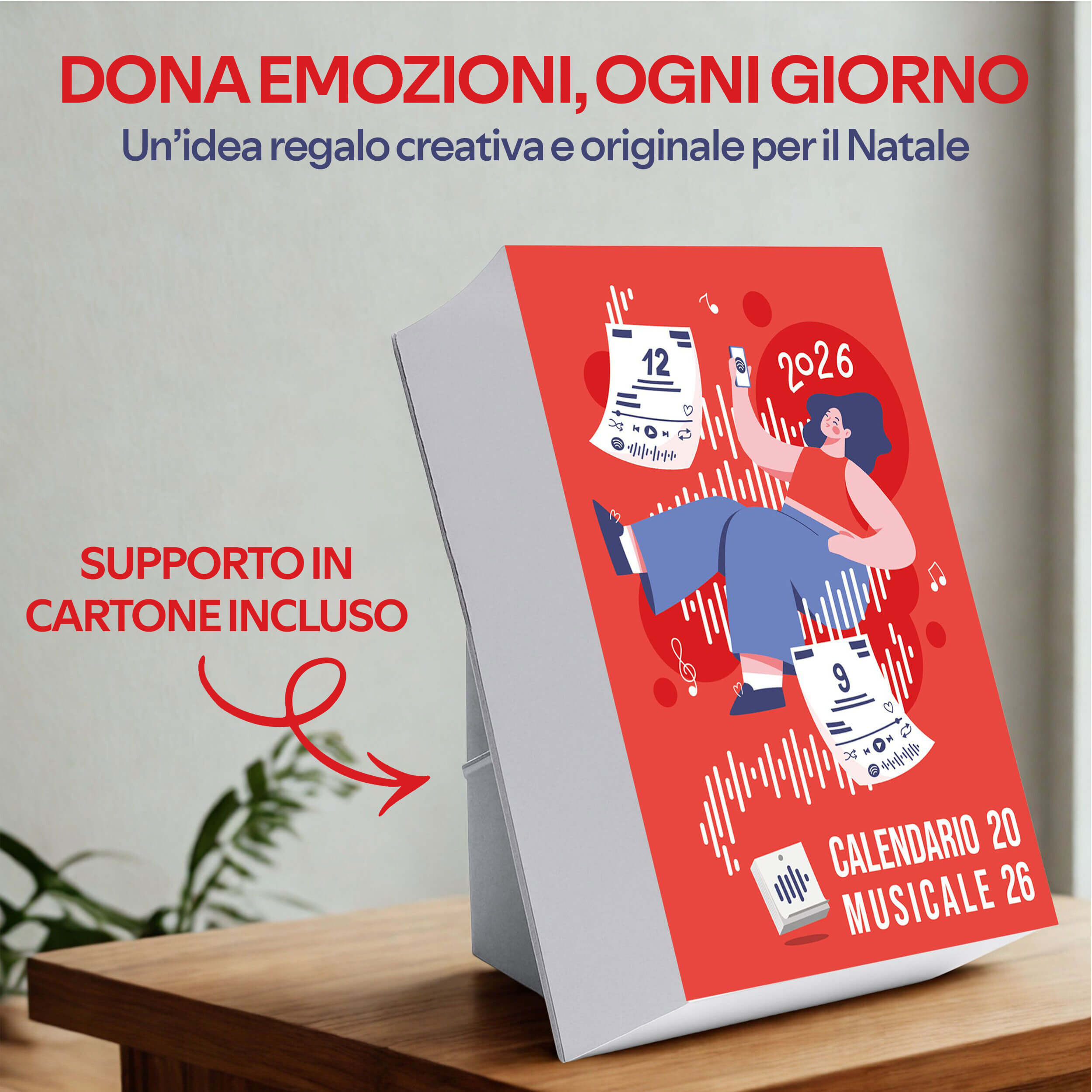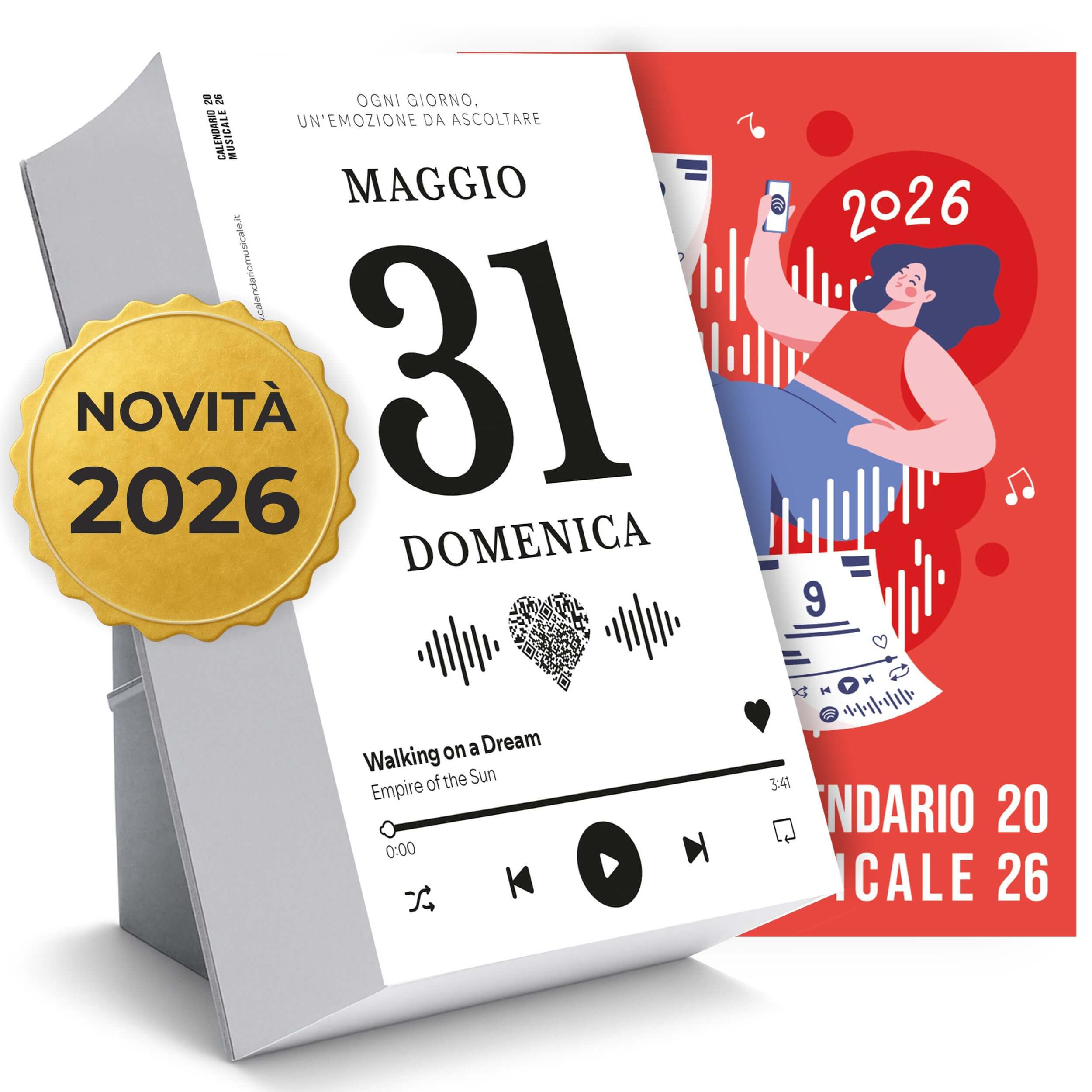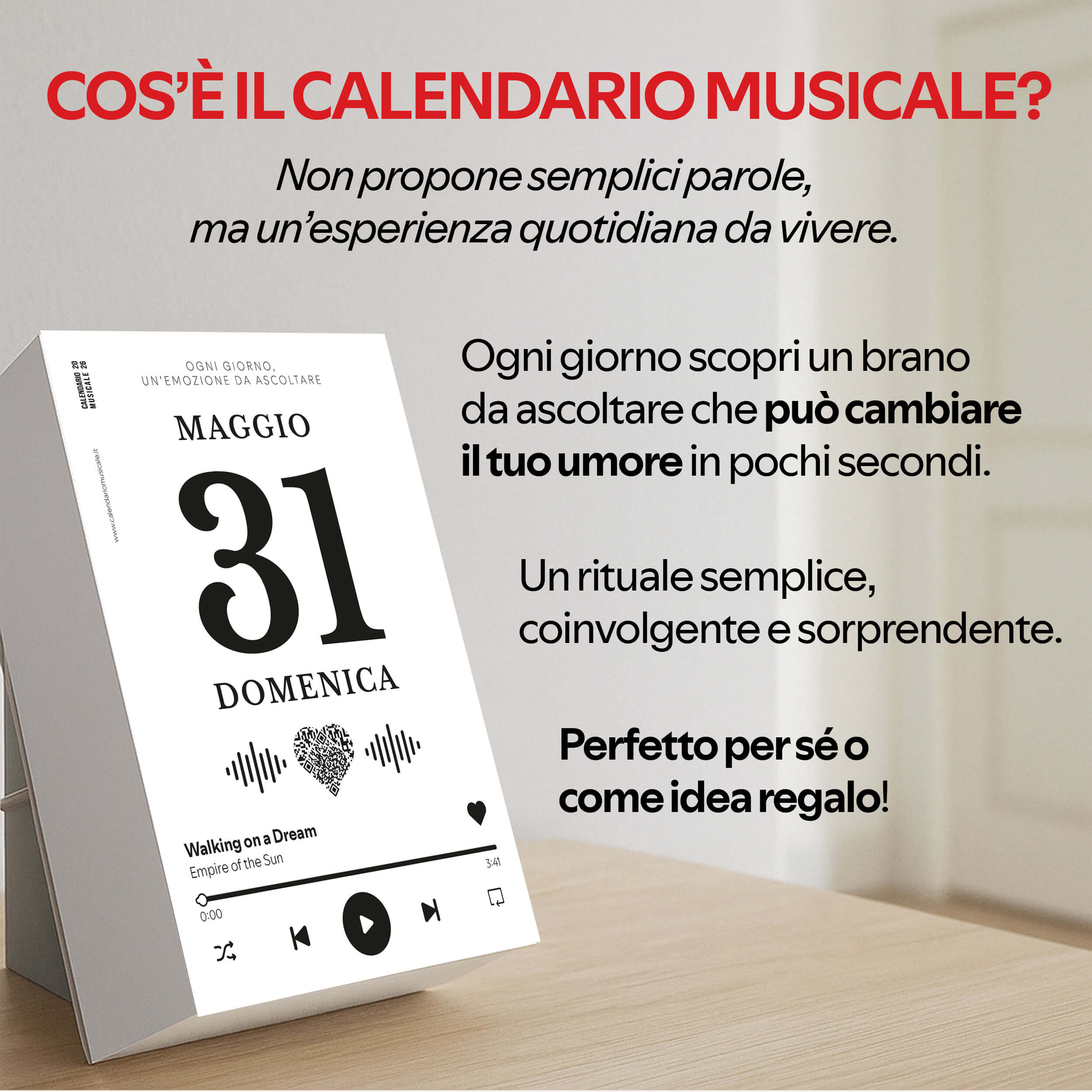 Un calendario da tavolo che ogni giorno ti regala una canzone, un pensiero e un momento di ispirazione. Formato A6 con QR da scansionare. 100% Made in Italy.